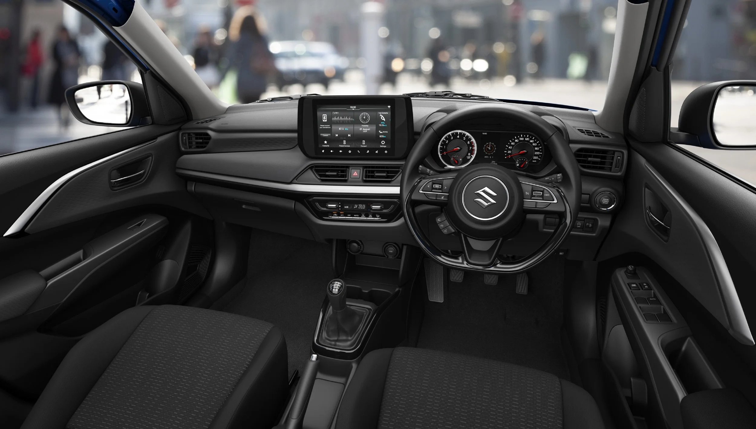 The Swift’s cockpit provides a truly immersive driving experience that is designed to put all the instruments and controls you need within easy reach. It features wrap around, black dashboard and front door trim giving the cabin a sporty look that heightens your driving fun.